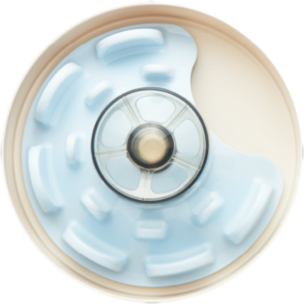 Spin UFO Maze is an advanced interactive food dispenser. By rotating the disc underneath, food can be gradually released via gravity from the two adjustable openings of the storage cap. The connection between action (rotating the disc), reward (food released per rotation) and challenge (slow feeding area) creates a fun feeding game and exercises your dog's mind.