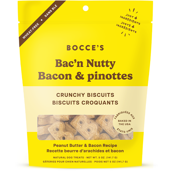 Bocce's Bakery Bac'N Nutty Crunchy Biscuits...need we say more? This crunchy treat is baked with only 3 all-natural ingredients. Oat flour, Peanut Butter, & Bacon make for a simple recipe with an extra dose of fun! Mmmm...bacon.