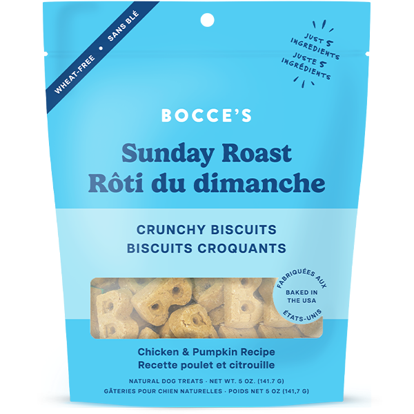 Bocce's Bakery Sunday Roast Crunchy Biscuits are made to enjoy every day. This crunchy treat is baked with only 4 all-natural ingredients. Oat flour, Chicken, Pumpkin, & Rosemary make for a simple recipe with an extra dose of fun! Simply delicious!