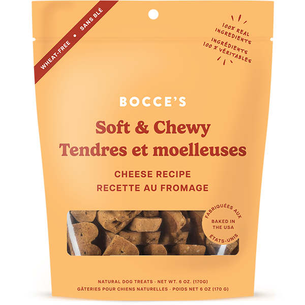 Bocce's Bakery Soft & Chewy Cheese Recipe Treats are favored by all - puppies, picky eaters, and seniors too. These soft & chewy baked "B" shaped cookies are made with limited ingredients (like Cheese, Rolled Oats, & Oat Flour). Perfect for pups looking for a chewier bite!