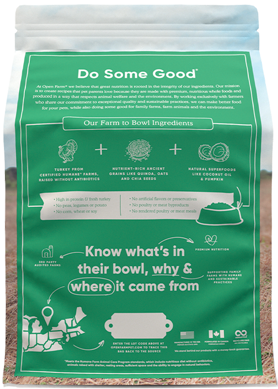 Open Farm Homestead Turkey & Ancient Grains Recipe is a tasty high protein, gluten-free meal is loaded with Certified Humane turkey that's free of antibiotics and growth hormones, wholesome grains like steel-cut oats, quinoa, and chia seeds and superfoods like coconut oil, pumpkin and turmeric. It's dry good-for-your-pup food made without peas, potatoes and legumes.