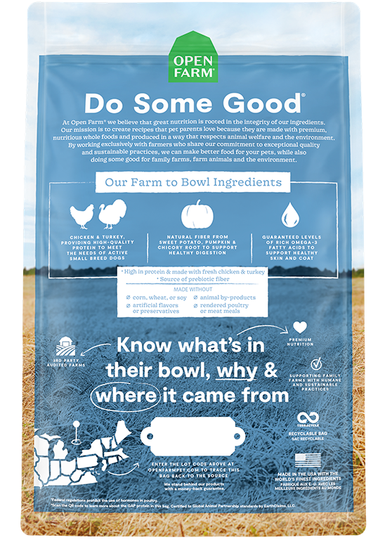 Formulated specifically for smaller breeds with higher metabolic rates, this bite sized recipe features a combination of humanely raised chicken, turkey and ancient grains blend, that’s free of peas, potato, and legumes.