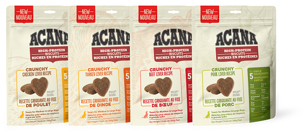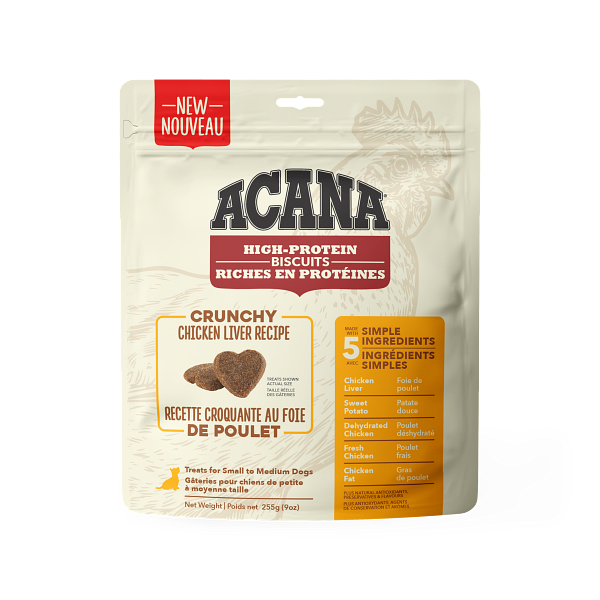 Made from just 5 simple ingredients, ACANA® High-Protein Biscuits Chicken Liver recipe are a great way to reward your dog with a delicious treat, without any guilt. They contain 85%* of total protein from animal ingredients like free-run chicken liver, and they’re also grain free. With no artificial preservatives added in our kitchen, treating your dog never felt so good.