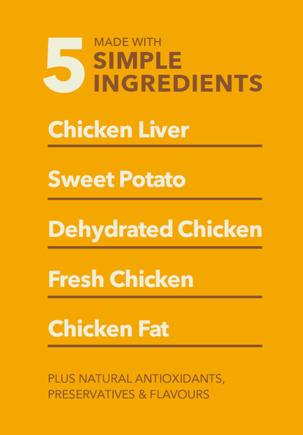 Fresh chicken liver (30%), dehydrated sweet potato (30%), dehydrated chicken (30%), fresh chicken (4%), natural flavour, chicken fat (2.5%)