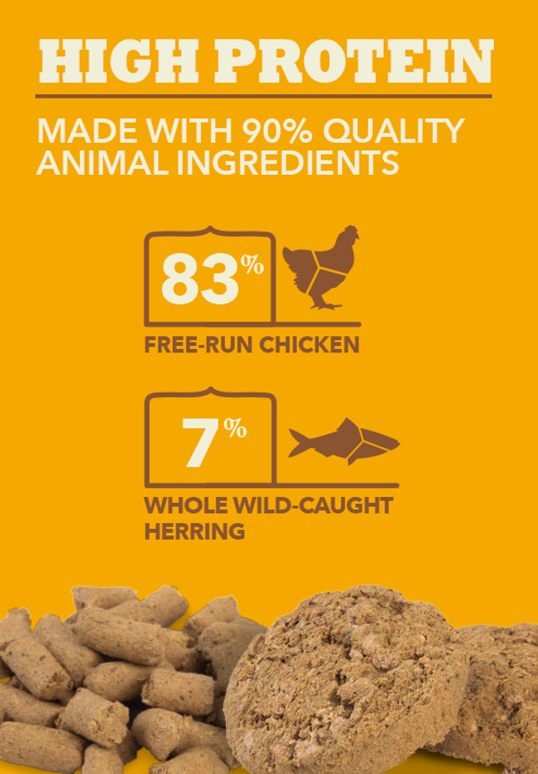 Fresh chicken with ground bone (73%), fresh chicken liver (8%), raw whole herring (7%), dehydrated pumpkin, natural chicken flavour (1%), fresh chicken heart (0.5%), chicken bone broth (0.5%), fresh organic butternut squash, fresh organic carrots, fresh organic pear, salt, dried chicory root, turmeric, dried kelp. Additives (per KG): Technological additives: with natural antioxidants. Nutritional additives: Vitamin E: 36 IU, Zinc proteinate: 120mg, Copper proteinate 1.5mg, Niacin: 50mg, Thiamine mononitrate: 25mg, Riboflavin: 10mg, Calcium pantothenate: 8mg, Pyridoxine hydrochloride: 7.5mg, Folic acid: 0.75mg, Vitamin B12 supplement: 0.1mg.