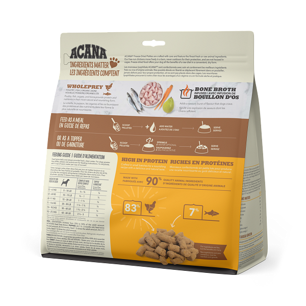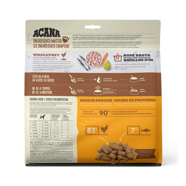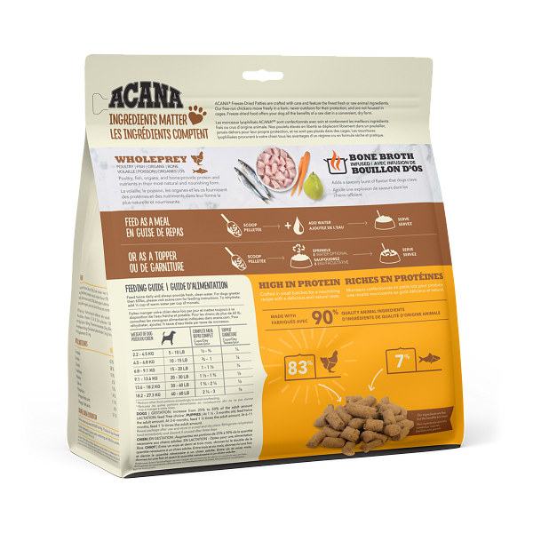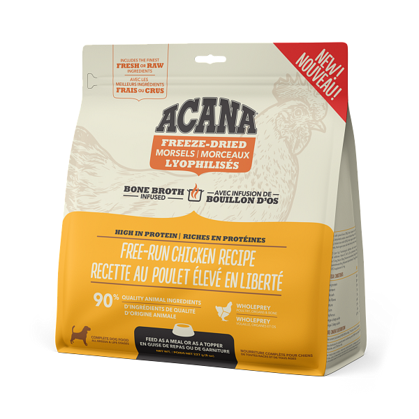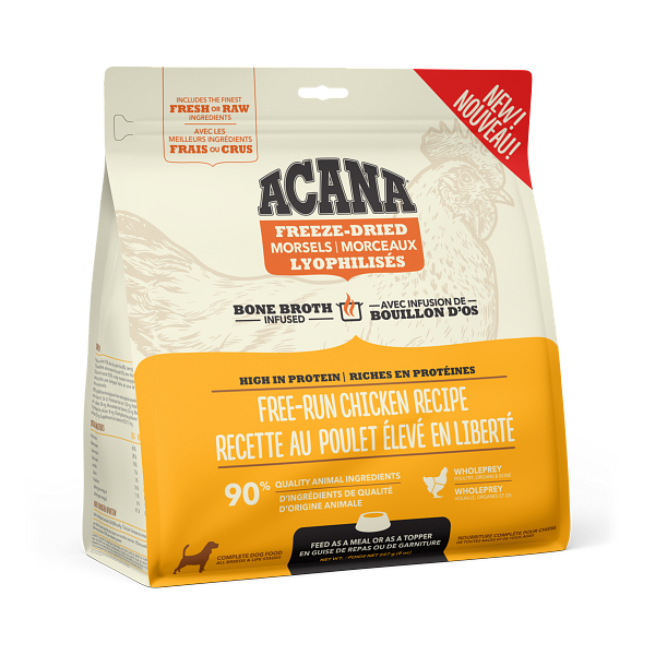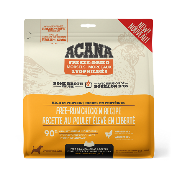 With all the benefits of raw nutrition and none of the mess, ACANA® Freeze-Dried Food, Free-Run Chicken Recipe satisfies your dog’s natural cravings in a convenient, freeze-dried form. Made from 90%* quality animal protein from free-run chicken and infused with delicious bone broth, you can serve morsels on their own or as a topper at mealtime.