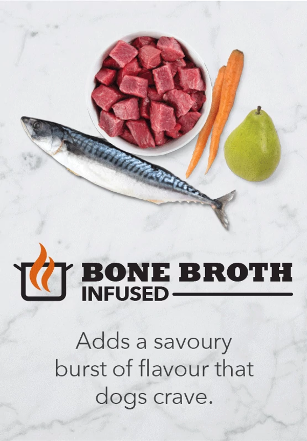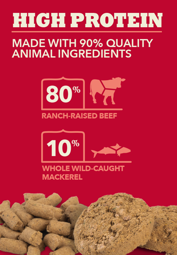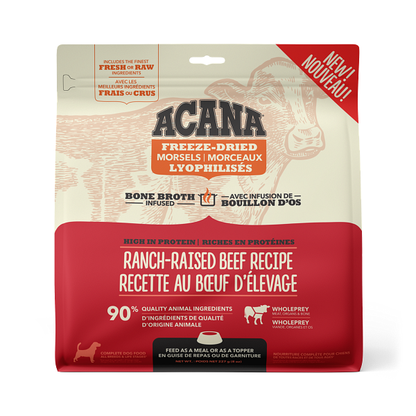 With all the benefits of raw nutrition and none of the mess, ACANA® Freeze-Dried Food, Ranch-Raised Beef Recipe satisfies your dog’s natural cravings in a convenient, freeze-dried form. Made from 90%* quality animal protein from ranch-raised beef and whole wild-caught mackerel, and infused with delicious bone broth, you can serve morsels or patties on their own or as a topper at mealtime.