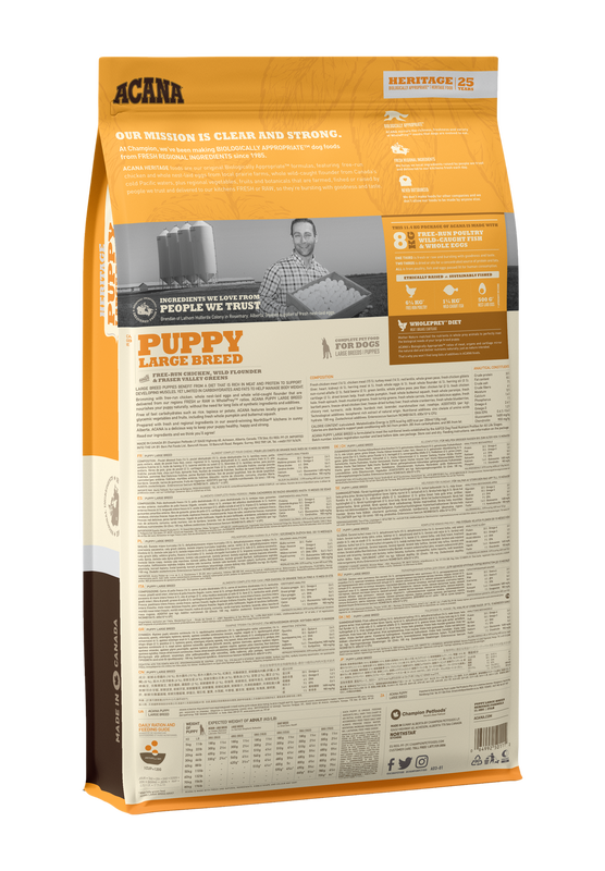 All puppies are not created equal. Your large-breed puppy has unique nutritional needs in order to support their rapid growth and bone development, including more protein and fat from whole animal ingredients. ACANA Puppy Large Breed is packed with free-run chicken and wild-caught flounder, in WholePrey ratios of meat, organs, cartilage, and bone, with the added nutrition of delicious cage-free eggs, for a diet that gives your growing puppy everything they need to grow up healthy, happy, and strong.