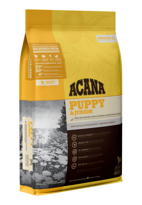 Dogs are born carnivores, bred for a diet that is rich and varied in fresh, whole animal ingredients. Your growing puppy needs protein and fat from animal protein, to support their rapid development. That’s why ACANA Puppy & Junior is brimming with fresh, free-run chicken and cage-free eggs from prairie farms, and wild-caught flounder from Canada’s Pacific, delivered fresh or raw by people we know and trust. In WholePrey ratios of meat, organs, cartilage, and bone, ACANA delivers nutrients naturally, in their most nourishing form, for peak health and development.