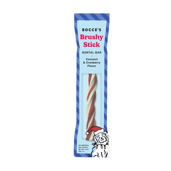Bocce's Bakery Brushy Stick Dental Bar For Dogs is a dental treat crafted with all-natural ingredients like coconut and cranberry, perfect for freshening up breath for smooches under the mistletoe. Its Candy Cane shape helps with extra cleaning of your pup's teeth.