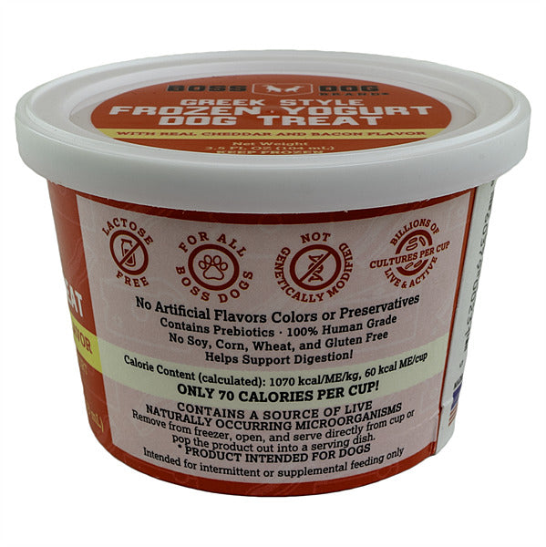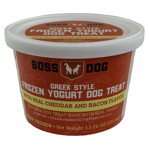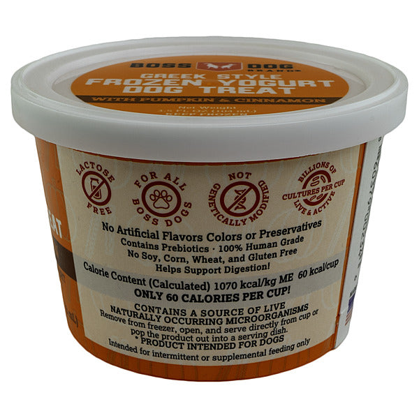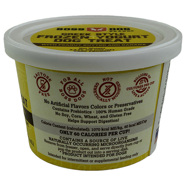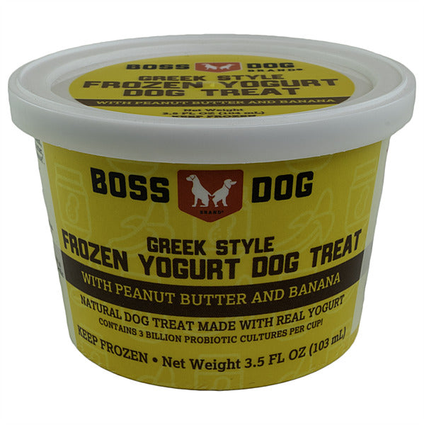Boss Dog® Brand Greek Style Frozen Yogurt Treats use 100% Human Grade ingredients with flavors that pets love. Be sure to stock your freezer with all four flavors for your pet! These frozen Greek Style Yogurts are a great daily treat. Try them after a walk for a cool down or even for training. Simply open and hold the cup and command away.
