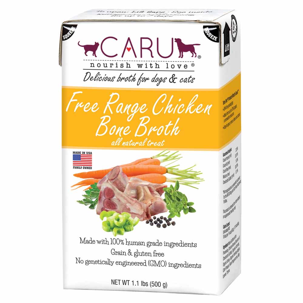 A delicious, naturally nourishing chicken bone broth made with 100% human grade ingredients in a human food plant in the USA. We start with free range chicken bones that are antibiotic free with no added hormones. Then we add organic carrots, organic celery and organic parsley. This superpremium broth is prepared especially for pets with no onions, garlic or added salt, preservatives or MSG. Slow cooked 18 to 24 hours, it contains 90% protein on a dry matter basis, nearly twice the protein of bone broths made for people. No wonder it looks, smells and tastes just like homemade!