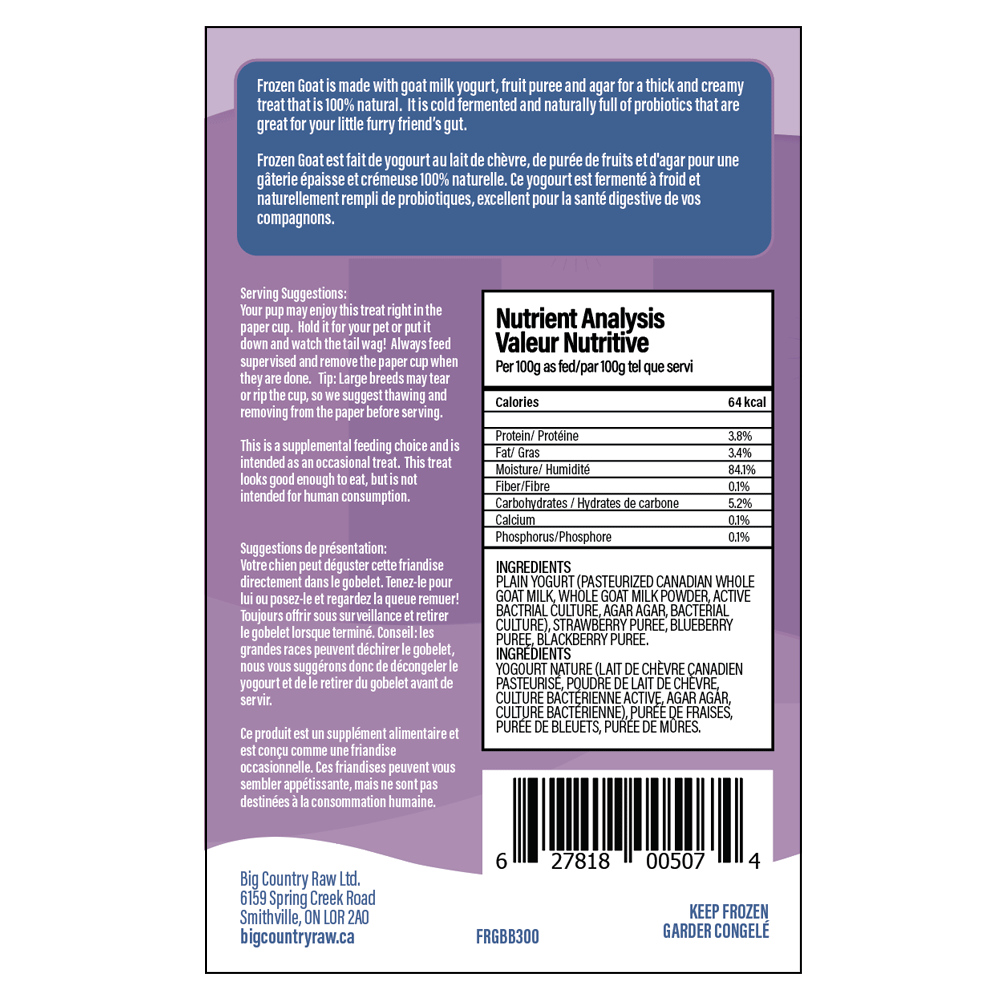 A decadent frozen treat your pet is sure to love! Frozen Goat is made with raw goat milk yogurt, fruit purée and agar for a 100% natural, thick and creamy treat. Our frozen yogurt is cold fermented and naturally full of probiotics that are great for your furry friend’s gut health.  Each box contains 3 x 100ml portioned cups of frozen yogurt.