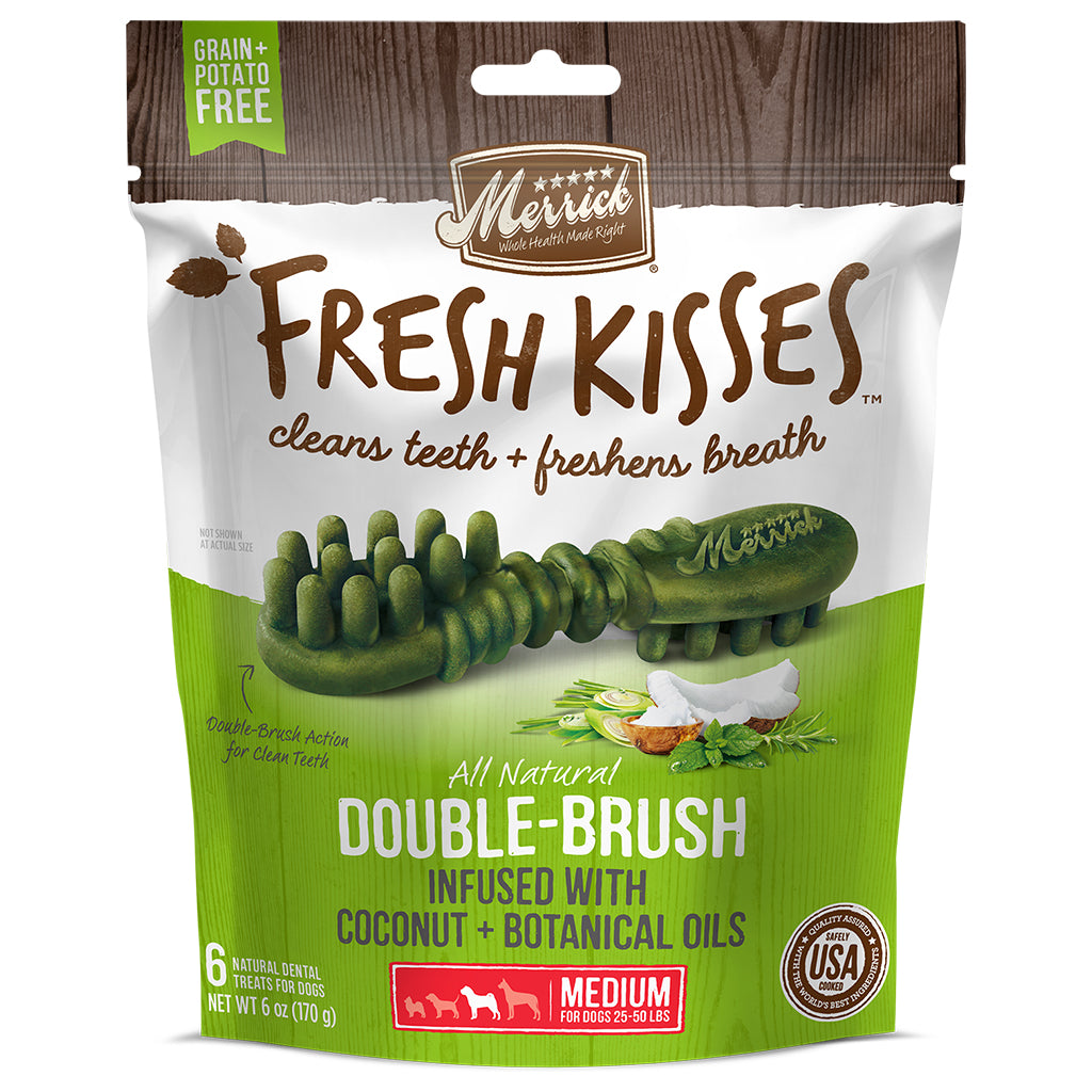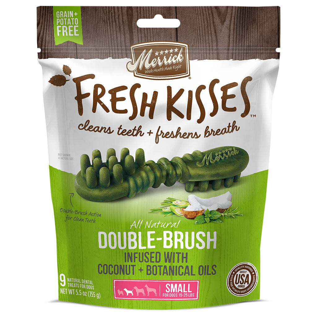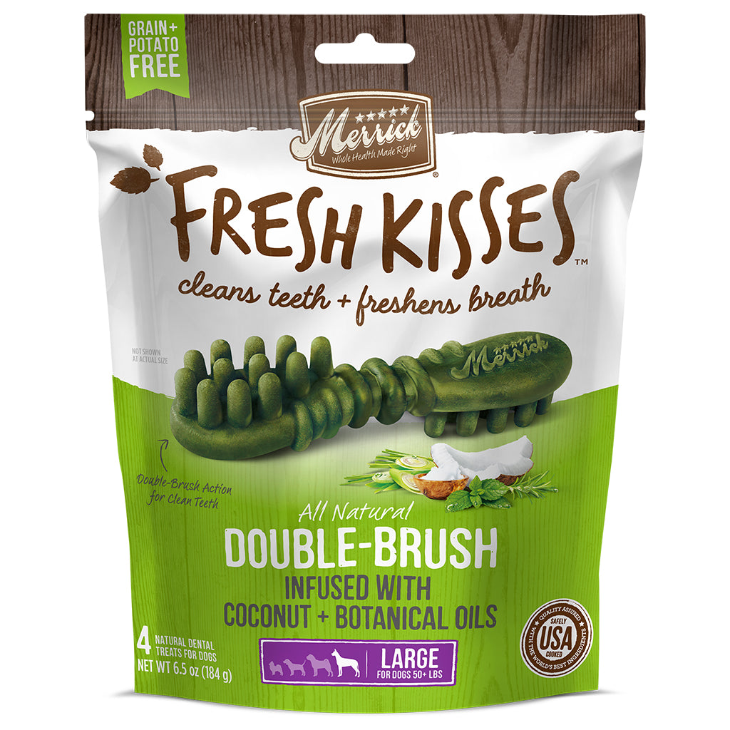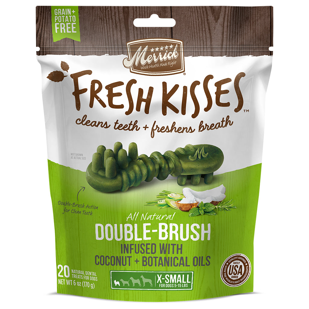 Merrick Fresh Kisses infused with Coconut + Botanical Oils are an innovative, natural dental treat designed not only to clean dogs’ teeth, but to truly freshen breath at the same time. Merrick Fresh Kisses feature a unique double-brush design that cleans teeth, and uses coconut + botanical oils to freshen breath.