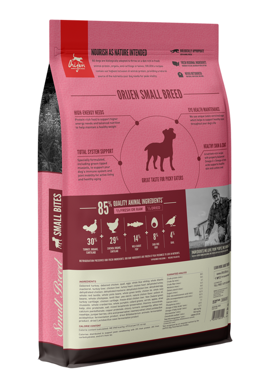 Your small-breed dog has certain nutritional needs and requires a Biologically Appropriate diet in order to thrive. ORIJEN Small Breed is made specifically for smaller dogs, with nourishing protein and nutrients packed into a unique kibble shape that is easier for them to eat. Formulated with balanced nutrition to maintain energy and a healthy weight, ORIJEN Small Breed has a great taste that dogs crave and ingredients that they need for peak health.