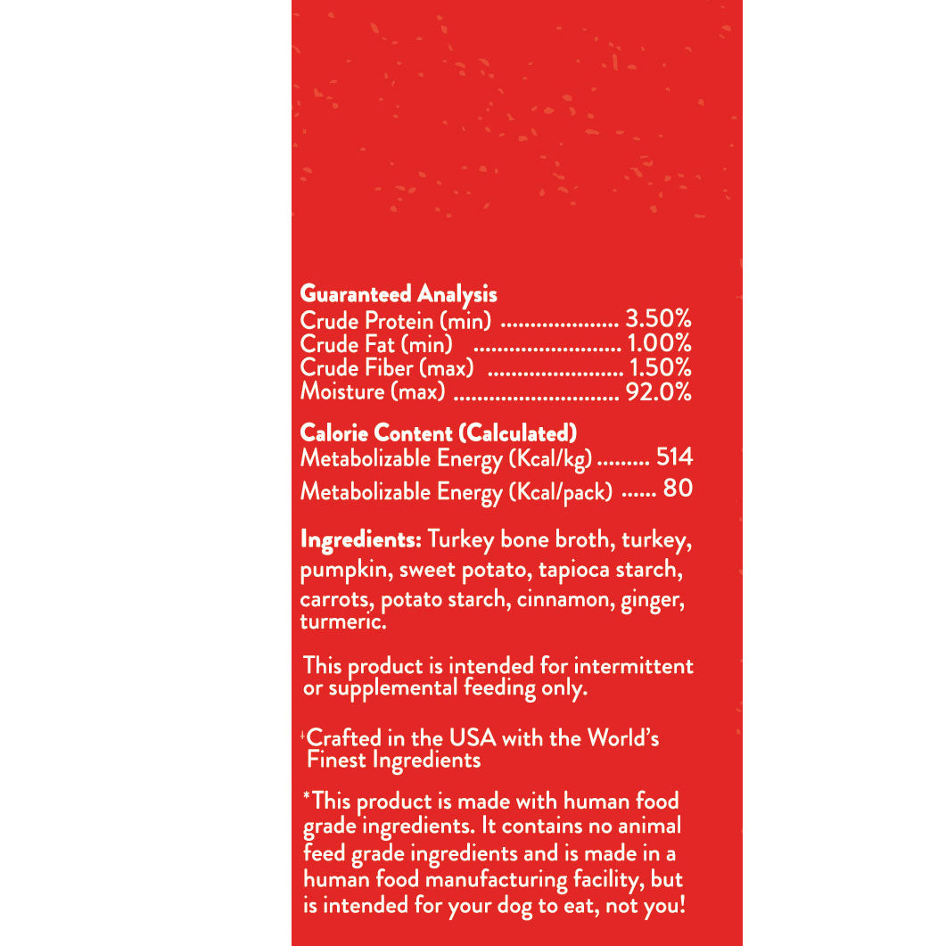 Turkey bone broth, turkey, pumpkin, sweet potato, tapioca starch, carrots, potato starch, cinnamon, ginger, turmeric.
