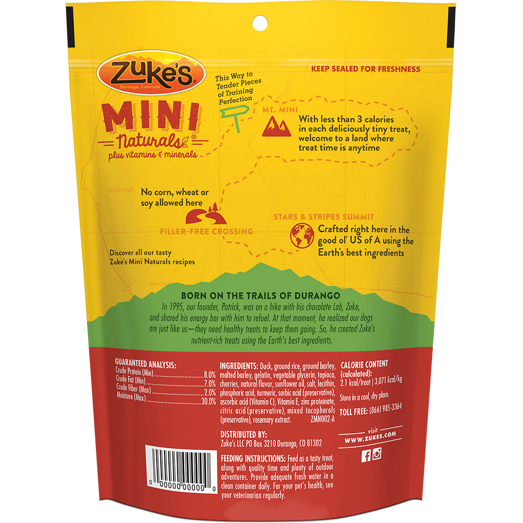 Wholesome, Tender Mini Bites for All Your Adventures in Training! Training is one of the biggest adventures you and your dog will set off on together. And with the right treat, you can keep each and every moment healthy and deliciously fun. At less than 3 calories per treat, Zuke's Mini Naturals are the perfect little size to fit every trainable moment that pops up. These tasty, tender morsels are specially crafted in the USA using the Earth’s best ingredients — like protein-rich meat, wholefood berries, savory herbs and NO corn, wheat or soy.