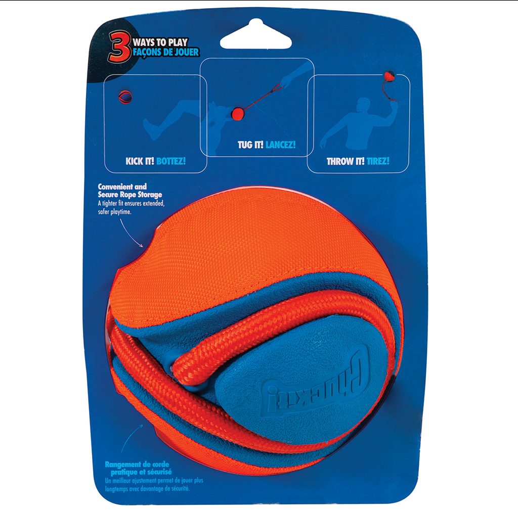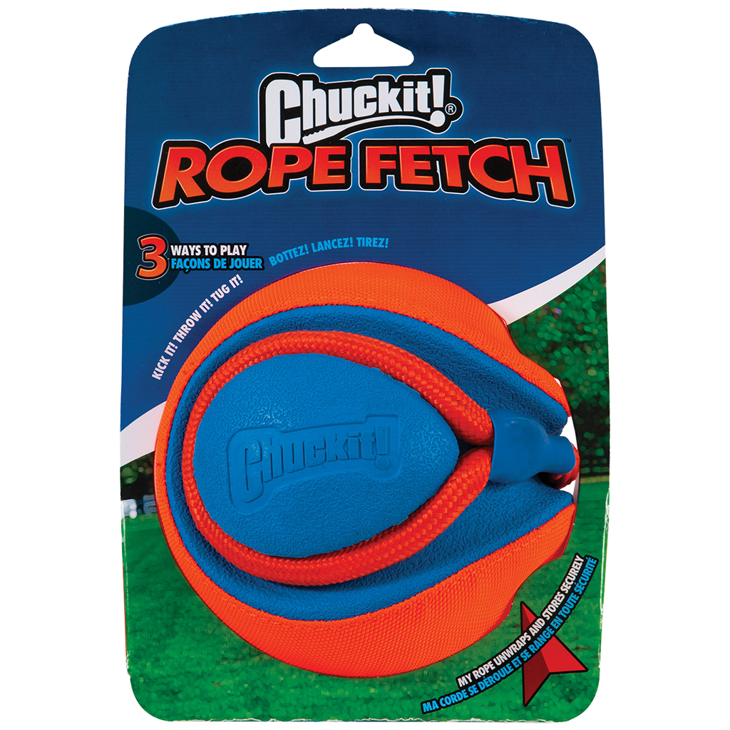 Kick it! Tug it! Throw it! The Chuckit!® Rope Fetch™ dog toy combines three ways to play into one unique toy. Transform the Rope Fetch into a tug toy by unwrapping the rope from the ball. Made from durable polyester oxford material, the rope features a handle for the pet owner while the ball features easy grip indentions that make it easy for your pet to bite or catch. Use the rope to throw the Rope Fetch farther during games of fetch. Wrap the rope securely around the easy grip design to enjoy kicking the ball around with your pup. Whether your dog likes to play fetch or tug-o-war, the Chuckit! Rope Fetch offers everything you'll need.