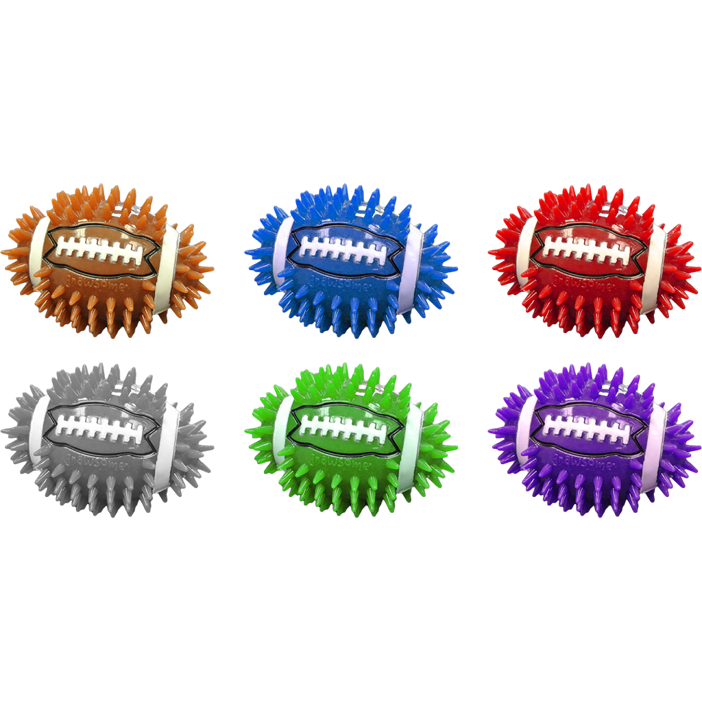 Score a touchdown with Gnawsome™ Large Squeaker Football. With a loud internal squeaker and a unique gum-massaging spikey texture these toys are sure to be among your pet's favorite! It can stand up to extra-tough rounds of fetch, but it’s soft and gentle on doggy gums, even for teething puppies. Since it’s made out of food-grade, BPA-free TPR rubber, it’s safe, non-toxic and perfect for everyday play in the yard, at home, or at the park! Plus, they come in an assortment of bright colors and different sizes to suit your pal’s size and bite.