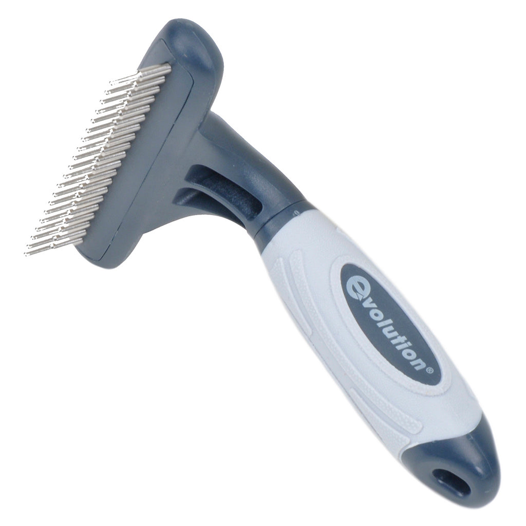 The Evolution Dog Undercoat Rake with Rotating Pins is designed for dogs with thick, heavy coats or with undercoats. The rotating teeth pull through the dog's coat without damaging it. Comfort grip handles make grooming your dog a pleasure. Rounded pins that penetrate deep into your dog's coat to remove loose undercoat.