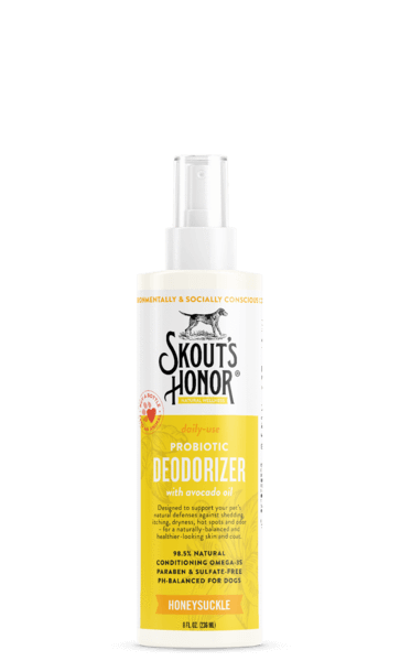 Gently nourish your furry friend’s skin naturally remove odors with Skout’s Honor Probiotic Honeysuckle Daily Use Pet Deodorizer! This probiotic spray formula is specially made with avocado oil and is designed to improve your pet’s skin and coat by combating shedding, dryness, itching, hot spots and especially that unwanted odor! This 98.5% natural daily deodorizer is paraben-free and sulfate-free, PH-balanced for dogs and contains conditioning omega-3s that hydrate and deodorize skin for a natural and neutral scent. Restore the balance back into your pal’s skin and coat the eco-friendly way with Skout’s Honor!