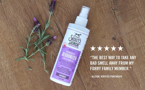 Gently nourish your furry friend’s skin naturally remove odors with Skout’s Honor Probiotic Honeysuckle Daily Use Pet Deodorizer! This probiotic spray formula is specially made with avocado oil and is designed to improve your pet’s skin and coat by combating shedding, dryness, itching, hot spots and especially that unwanted odor! This 98.5% natural daily deodorizer is paraben-free and sulfate-free, PH-balanced for dogs and contains conditioning omega-3s that hydrate and deodorize skin for a natural and neutral scent. Restore the balance back into your pal’s skin and coat the eco-friendly way with Skout’s Honor!