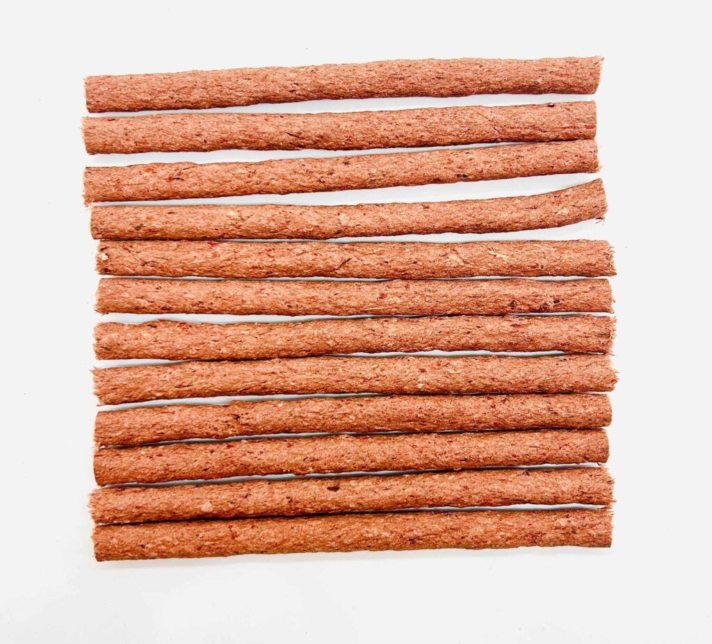 An all NATURAL 100% BEEF STICK is a great chew which has beef pizzle, lung, meat, collagen, tendon all ground up in a stick form which is 5″ long and as thick as a pencil. A pleasant beef odour dogs love.