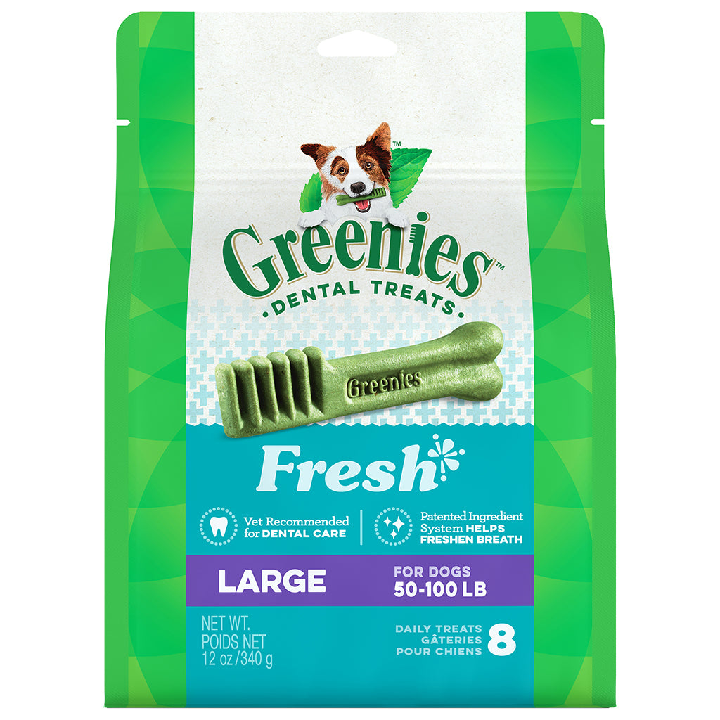 One GREENIES™ Fresh Flavor Dental Treat is all it takes for clean teeth, fresh breath and a happy dog. Your dog can't wait to sink their teeth into these delicious dental dog chews because they are bursting with breath-freshening mint flavor and feature a delightfully chewy texture that fights plaque and tartar. Irresistibly tasty and incredibly powerful, GREENIES™ Treats for Dogs are recommended by veterinarians for at-home oral care. Best of all, these dog treats are made with highly soluble ingredients that are easy to digest. Give your dog the mouth-wowing treat that helps promote oral health with GREENIES™ Dog Treats