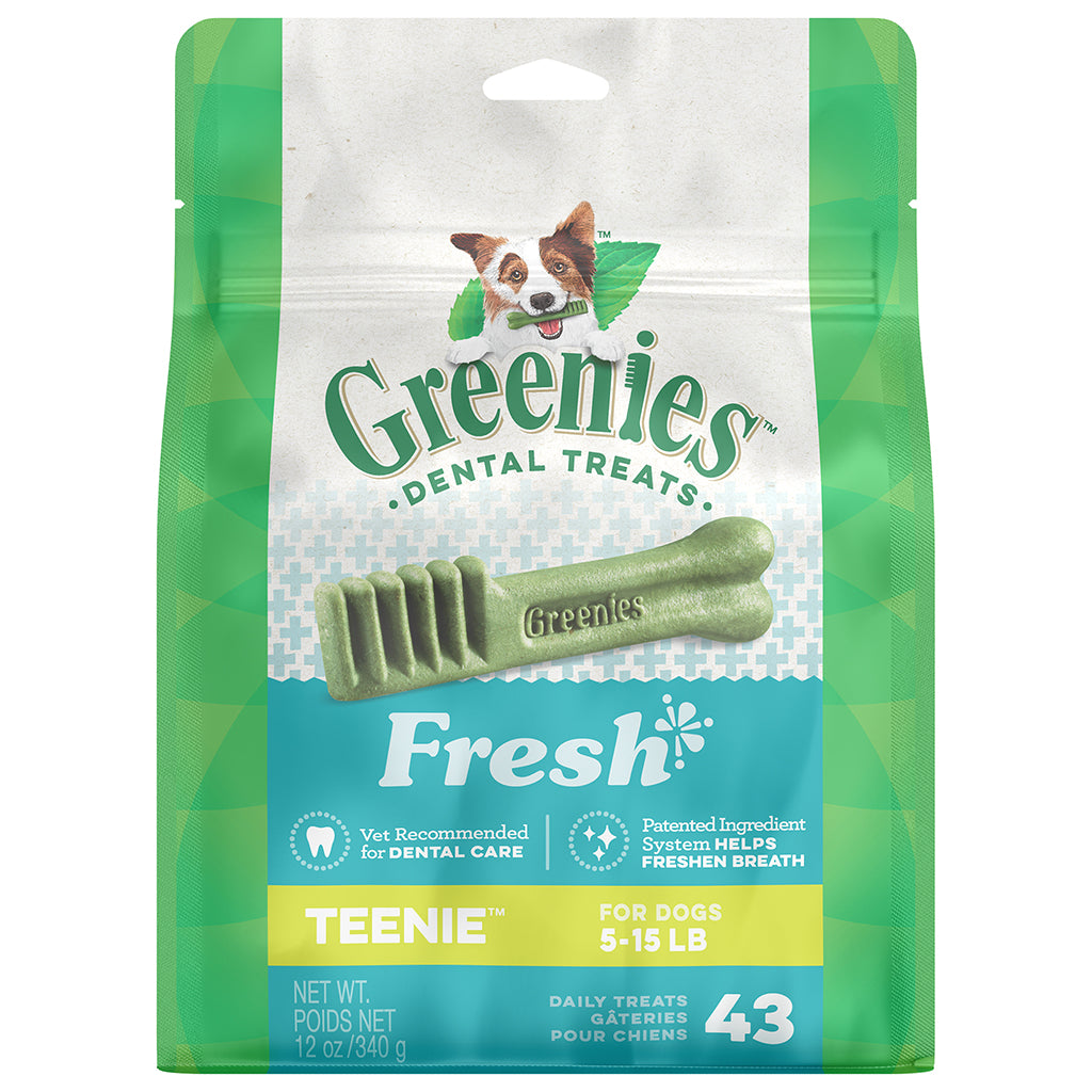 One GREENIES™ Fresh Flavor Dental Treat is all it takes for clean teeth, fresh breath and a happy dog. Your dog can't wait to sink their teeth into these delicious dental dog chews because they are bursting with breath-freshening mint flavor and feature a delightfully chewy texture that fights plaque and tartar. Irresistibly tasty and incredibly powerful, GREENIES™ Treats for Dogs are recommended by veterinarians for at-home oral care. Best of all, these dog treats are made with highly soluble ingredients that are easy to digest. Give your dog the mouth-wowing treat that helps promote oral health with GREENIES™ Dog Treats