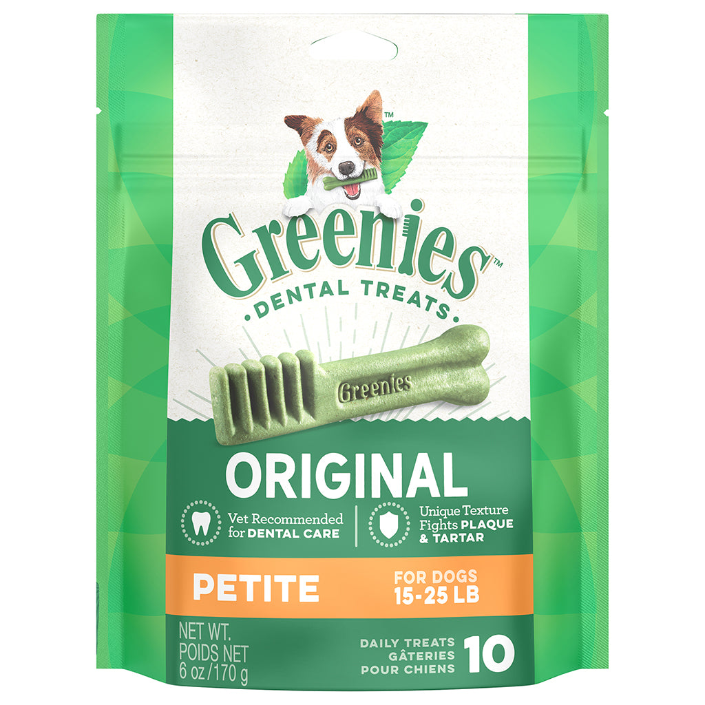 One GREENIES™ Original Dental Treat a day is all it takes for clean teeth, fresh breath and a happy dog. Your dog can't wait to sink their teeth into these delicious, original-flavor dental dog chews because they feature a delightfully chewy texture that fights plaque and tartar. Irresistibly tasty and incredibly powerful, GREENIES™ Treats for Dogs are recommended by veterinarians for at-home oral care. Best of all, these natural dog treats are made with highly soluble ingredients that are easy to digest. Give your dog the mouth-wowing treat that helps promote oral health with GREENIES™ Dog Treats.