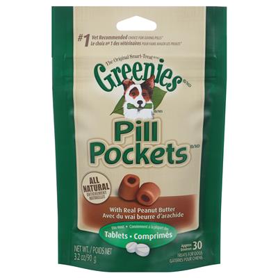Pets are smart about avoiding their meds, but you're smarter. Designed and recommended by vets, GREENIES™ PILL POCKETS™ Treats for Dogs make it easy to give your dog medicine. Don't hide medicine in human foods, such as peanut butter or cheese. Give a healthy, low-calorie dog treat instead. GREENIES™ PILL POCKETS™ Treats take the stress and mess out of administering tablets or liquid medication to your dog. Our easy-to-use pouches mask the smell and taste of medicine and deliver a real peanut butter flavor your dog will love.