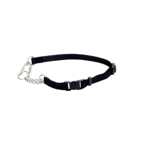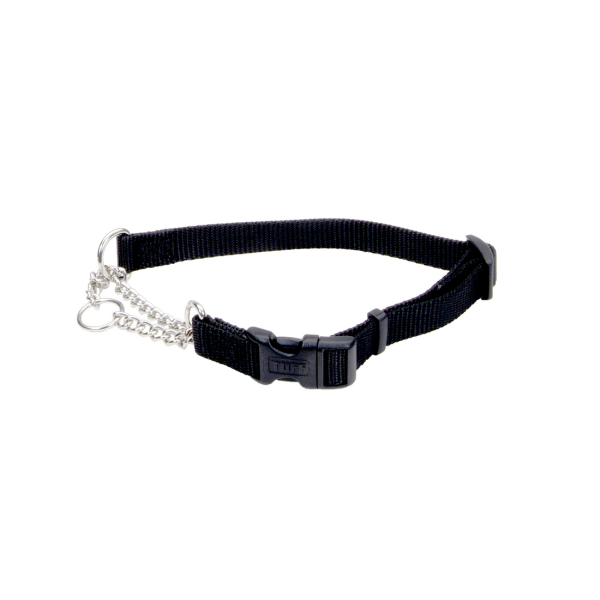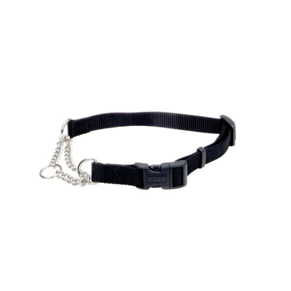 The Adjustable Check Training Collar with Buckle for Dogs features a buckle that allows you to easily put the collar on your dog or remove it. This training collar has a limited-closure chain loop combined with a nylon collar for gentle correction. The limited-closure chain loop prevents the collar from becoming too tight while the nylon reduces loss of neck hair. Gentle correction training is an excellent way to build a relationship with your dog. These collars are not for use with tie out.