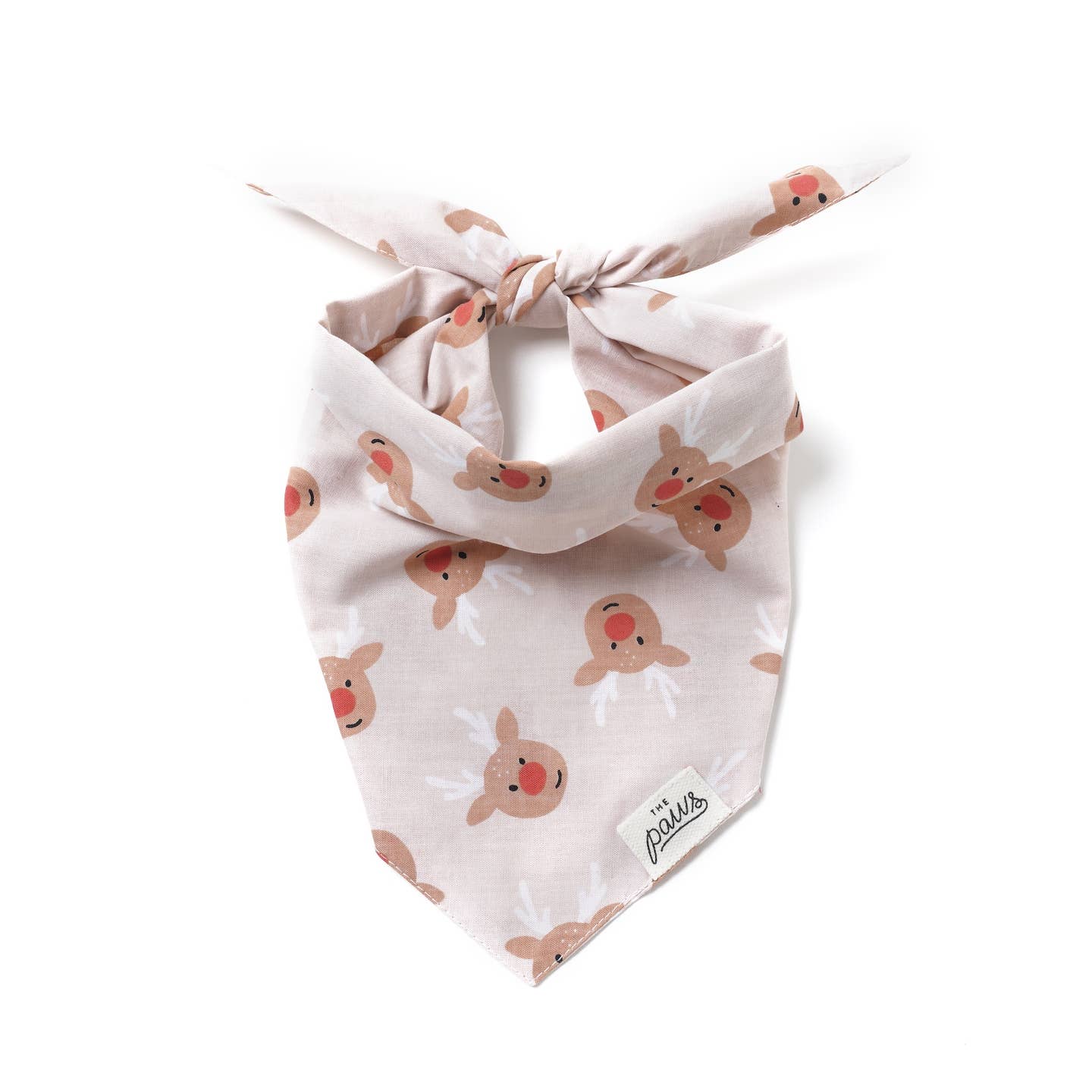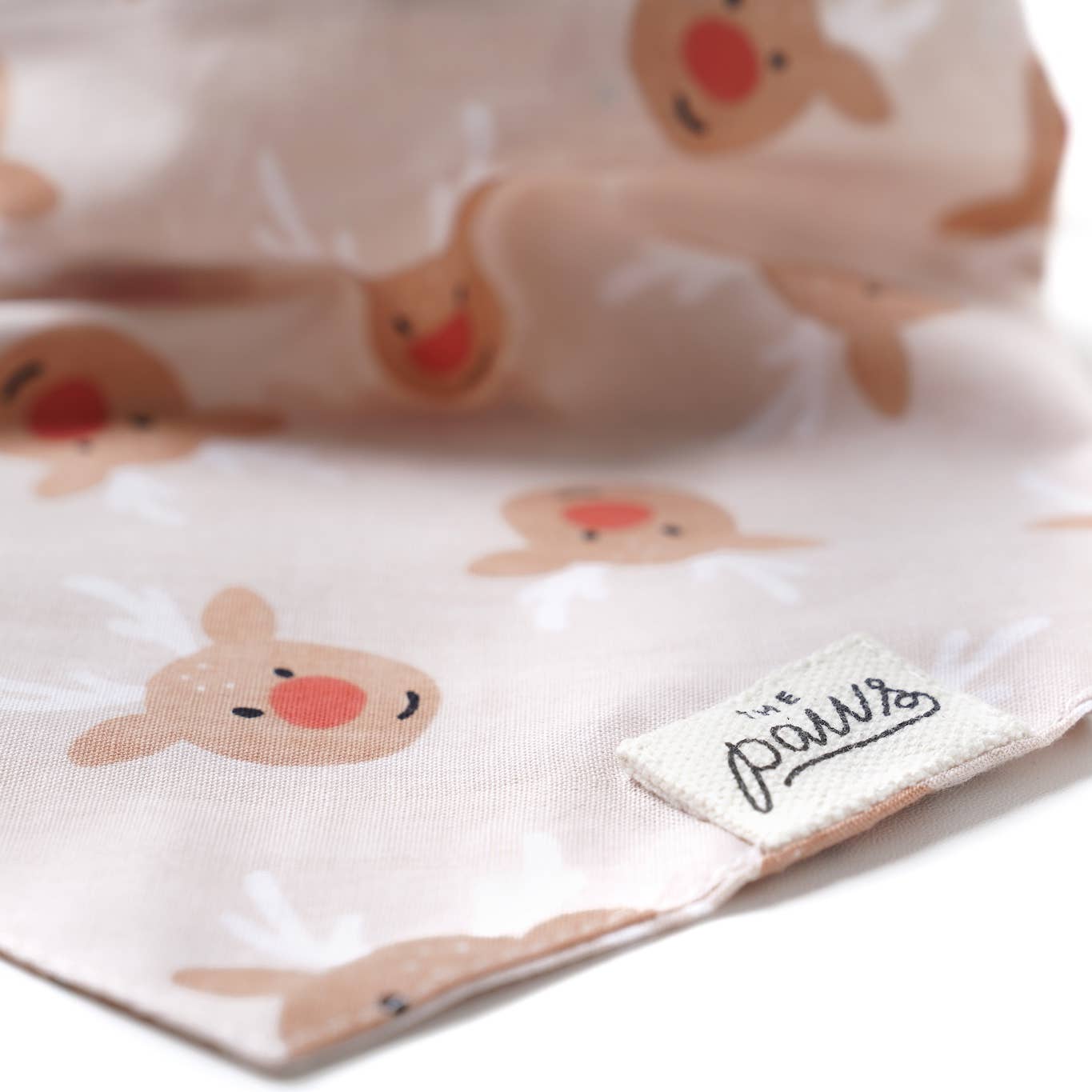 Rudolph dancing around with Christmas fun on this bandana from The Paws See other designs in the Christmas and Winter Collection from The Paws Tailor cut double sided dog bandanas - sized & ready to tie on - Triangle shape, no folding needed